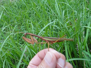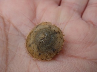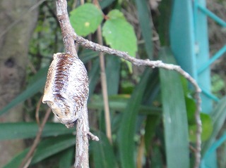【左】ハラビロカマキリの卵鞘 【中】オオケマイマイ 【右】カマキリの遺骸