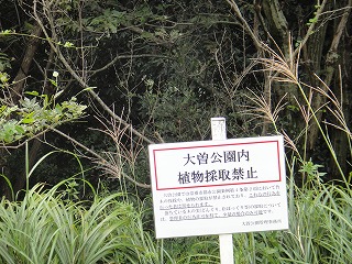 【左】園内は「植物採集禁止」 【中】雑木林 林床 【右】キノコベンチ