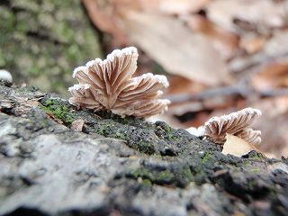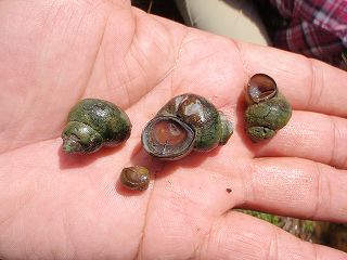 【左】タニシ(マルタニシ?)       【中・右】スエヒロタケ…上側からと下側から撮ったもの