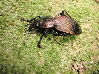 【左・中】コバノカモメヅルの袋果の殻    【右】オオオサムシ…散策路上にあった死骸
