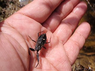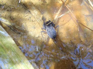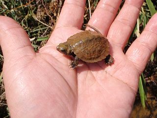 【左】水中で隠れているつもりのヒメタイコウチ 【中】ヒメタイコウチ  【右】イシガメの赤ちゃん