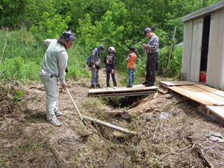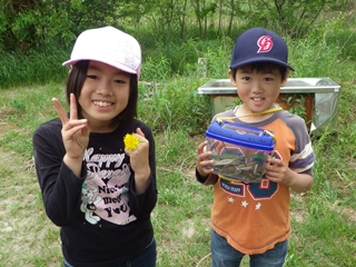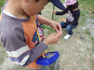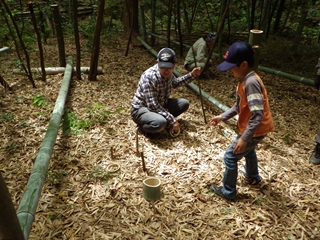 計画では竹やぶの中を歩きながら観察を兼ねた遊びも考えていたわけですが、実際は一ヶ所に準備した“遊び道具”だけで十分満足し終わってしまいました。その証拠というわけではありませんが参加した子は飼育ケースだけでなく昆虫図鑑を持ってくるほどの“虫さん好き”らしい子でありましたが、クワガタの幼虫やベニカミキリを見せてもほとんど見向きもせず、遊びに遊んでいました。