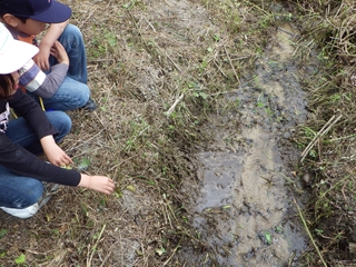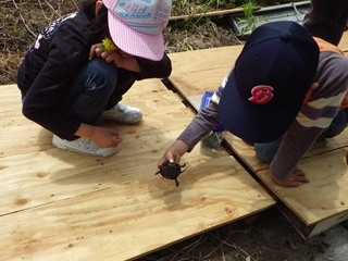 【左】小川で亀さん(イシガメ)の観察 【右】「今日はとっても楽しかった」という感想でした