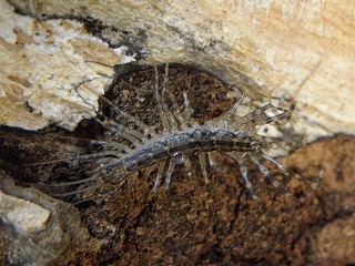 【左】アメリカジガバチ(外来)の巣 【中】ケバエの仲間? 【右】ゲジ、小さな虫を食べています