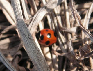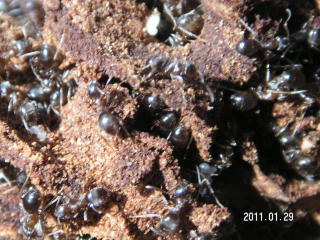 【左】ナナホシテントウ 【中】フタホシヒラタアブ(エゾコヒラタアブ)?(成虫越冬と思われます) 【右】トビイロケアリ?(朽ち木の中に営巣していました