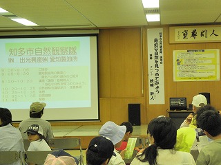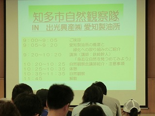 今回の観察会は知多市の環境調査隊特別版として出光興産(株)愛知製油所で、「海につくった森」で夏の生き物を観察しようというテーマで行われました。特別講師として鉄崎幹人氏をお招きして「身近な自然を見つめよう〜生きものって面白い〜」というテーマでの講演を聞いた後に皆で樹林帯を観察しました。