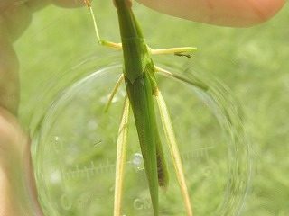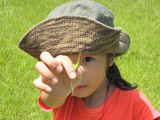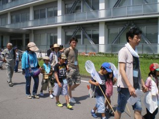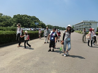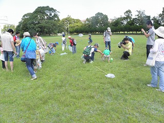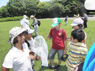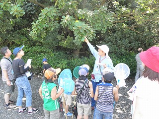 【観察した生きもの】 クマゼミ、アブラゼミ、ニイニイゼミ、キチョウ、アオスジアゲハ、ヒメアカタテハ、カブトムシ、コクワガタムシ、コオロギ、ショウリョウバッタ、ヒメギス、イナゴ、ツチイナゴ、キリギリス、クルマバッタ、マダラバッタ、クビキリギリス、ツユムシ、カマキリ、アオクサカメムシ、アシナガバチ、クモ、ダンゴムシ、ゴキブリ、カタツムリ、ナメクジ キジ、ドバト、カラス、ヒヨドリ、スズメ、ノウサギの糞 【観察会の様子】