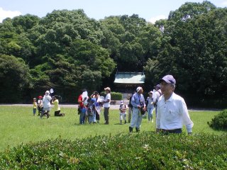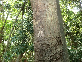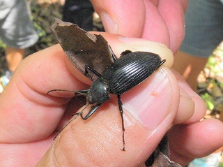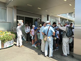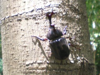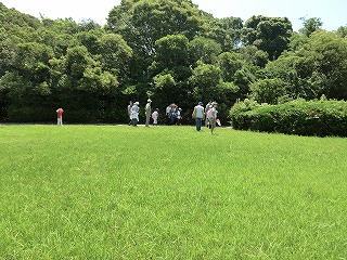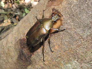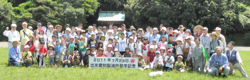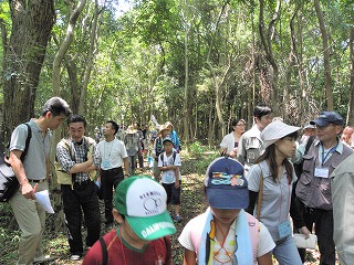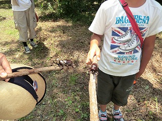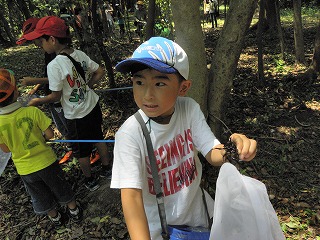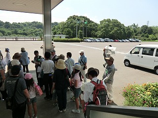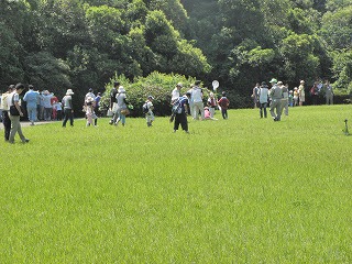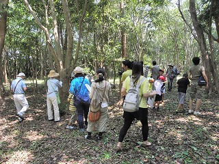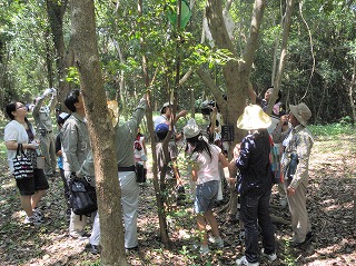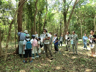 講演が終わってから10グループに分かれて宗像神社から南に向かってグリーンベルトを観察しました。ここは海を埋め立てた造成地で、幅100mで距離は6kmにわたって計画的に植樹されたとのことです。当事業所のグリーンベルトはその内の2kmだそうです。宗像神社前の草地で講演に出てきたノウサギの糞をたくさん見つけました。臆病な動物で夜しか活動しないようです。神社周辺ではご神木のカシワの木をはじめとしてシマトネリコ、シイ、クスノキなどが観察されました。森を少し離れて見るとクスノキにクズが絡みついて上へ上へとつるを伸ばしていました。子供たちの興味はチョウやトンボやセミなどですが、参加者の人数に比べて少なかったせいかなかなかつかまりませんでした。正門より南の樹林帯への入り口にはミゾコウジュの保護区が設けてありました。樹林帯の中は歩きやすく整備され、周りの木々もかなり間引かれていて草や若木が育っていました。そしてその奥に子供たちを喜ばせるメーンエベントが待っていました。シマトネリコと周辺の木の幹に無数のカブトムシがいました。昼間とあって活動は鈍く簡単に捕まえられました。カブトムシが飛んできて女の子にとまって女の子を泣かせるというハプニングもあり、飼育箱に雄と雌のカブトムシと腐葉土も入れて持ち帰っている用意周到な家族もあったりして、カブトムシにはみなさんが満足されたものと思いました。特別講師の鉄崎さんは常に積極的に指導されて参加者に多くのものを残して行かれました。また私たち指導員にも多くの教訓を残されました。再び宗像神社に戻って前の広場で記念撮影をして解散しました。(記・大野)