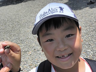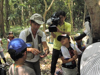 【左】鉄崎幹人氏にカブトムシの捕まえ方うを教えてもらっています。     【中】さらに奥を散策           【右】当会会員作の焼竹製のクワガタをプレゼントされ大喜び