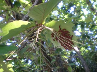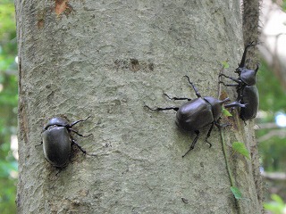【左】ノウサギが出てくる芝生広場          【中】森をア散策         【右】シマトネリコにカブトムシがたくさん張り付いていました。
