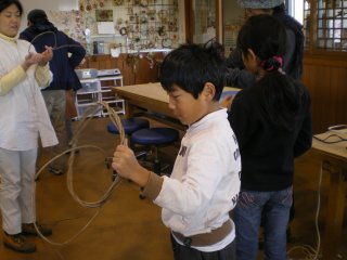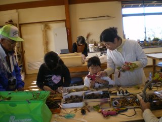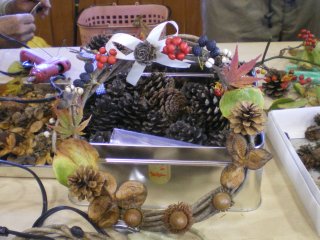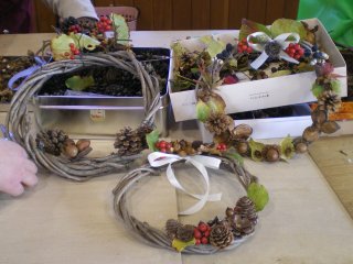 今回のリース作りは会員が用意したフジの蔓を丸く巻くことからスタートました。要領がわかるまで少し時間はかかりましたが良い大きさの輪ができました。マツボックリやツバキの殻とか白や赤の木の実などをホットボンドでくっつけてリースを作りました。(記・大野)