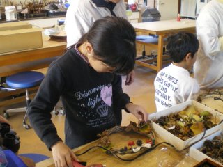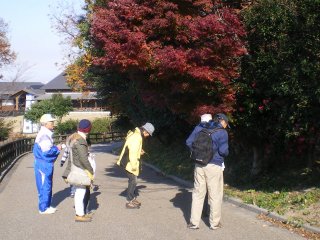 昨日の風も治まり、絶好の観察会日和でした。まず木や草を観察しながらリースの材料を集めました。コナラとモミジの紅葉(黄葉)をみてその下のドングリを探しましたがきれいな物は多くありませんでした。一方アラカシのドングリは小さいものの新しいものがたくさん落ちていました。ナンキンハゼの実ははじけて白くなっていて木の上の方の枝でカワラヒワが盛んに実をついばんでいました。ツバキやサザンカの殻とを拾って梅の館に戻りました。
