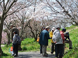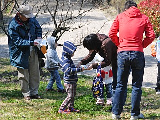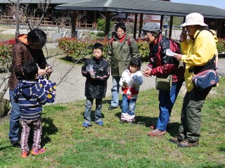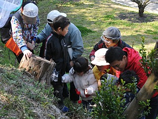 春の訪れを待っていたかのように、野草の花が、一斉に咲き、ソメイヨシノやシダレザクラが、美しく咲き乱れていた。 初めに、よく見かける標本の野草と同じ物を探し、次に、昨年観察した、生き物のデーターと合わせながら観察していった。途中、ツバキが沢山生えていたので、「ツバキは、葉が厚いので、厚葉木(アツバキ)とか、葉に艶があるので、艶木(つやき)とか言われて、しだいに、ツバキとなったそうです。」と言うと、みんなが葉っぱを触りだし、納得したようだ。 昨年より、沢山の生き物が見つかり、わかちあいの後、感想を聞くと、子ども達は、恥ずかしそうに「楽しかった。」と答えてくれた。(記:吉房)