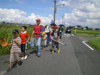 上空に寒気が入っているとの天気予報で、気温は高かったが風があって少しは助けられました。地域文化センターから水田の間の細い道を、周りを観察しながら神田川の観察ポイントを目指して歩きました。この道は道幅が狭いにもかかわらず車に通行が多いので注意が必要です。U字溝や水田にはジャンボタニシ(スクミリンゴガイ)がごろごろいて稲の茎やU字溝の壁にピンクの卵が産みつけられていました。神田川は大きなコンクリートのパイプを横倒しにして上側を切り取ったような構造をしていて脚立やはしごなしではとても上がり降りできません。橋のすぐ下流にはしごをかけ、順々に川に入りました。いったん川に入るともう暑さなど忘れて魚やカニを追いかけます。川の底に沈んでいた鉄パイプを揚げてタモで受けると大きなウナギが取れました。水槽に入れたのですがすぐに尻尾を使って逃げ出し、川にチヤポンと落ちてしまいました。浅井さんの執念が再び別のウナギを捕えましたが残念ながら「逃げたウナギは大きかった」となりました。大人のひざ下程度の水深ですがいろいろな生き物がたくさん取れました。11時少し前に川を上がり、皆さんに紹介して現地で解散しました。(記・大野 )
