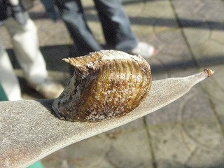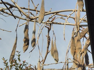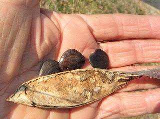 【左】ハラビロカマキリの卵塊           【中】フジの果実            【右】フジの種と鞘