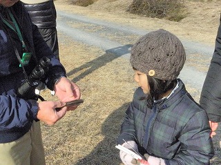 【左】佐布里池のカモ観察           【中】羽根の構造を説明           【右】ジョウビタキ♀