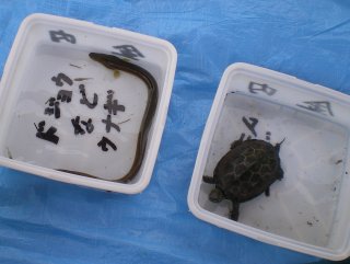 【左】ウナギとモクズガニと? 【中】クサガメ 【右】田んぼのフナ