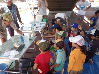 小一時間の活動後、川から上がると環境課の準備したたっぷりの水で手足を洗い(これが結構時間がかかりました)、それから捕まえたものの説明です。この説明場所は道路横断用の陸橋の下で直射日光が当たらないので大変都合の良い場所です。一通りの説明で終わりましたが子どもたちは自分が捕まえたものの説明には特に目を輝かせておりました。目の前の川で実際に捕ったということが影響しているのですね。