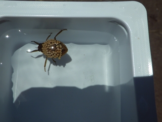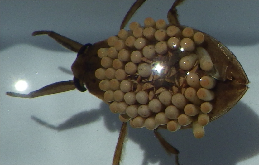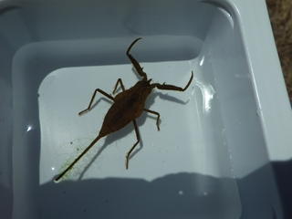 【左】捕まえたものの説明。子どもは近くへ集合 【右】卵を背負ったコオイムシ。背負うのは♂(オス)