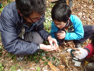 この親子、特に子どもは昆虫好き少年で始めの挨拶で見せた幼虫の写真も“キマワリ”ということを知ってました。そこで、前置きのお話はほとんどカットして、早速、昨日下見した例年の場所へ直行、即、生きもの探しとなりました。
