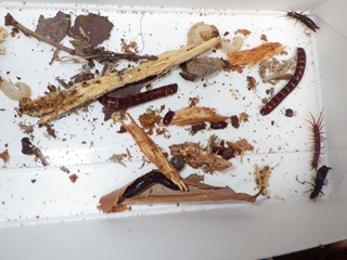 【左】観察した生きもの ※よく見るとマクラギヤスデの隣にキセルガイがある(写真をクリック)