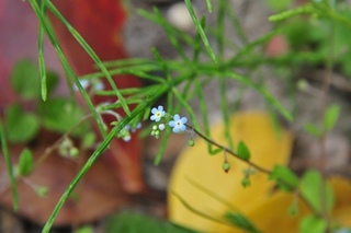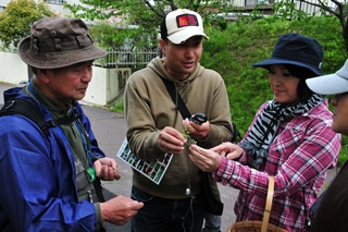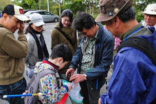 【左】キュウリグサの花をルーペでしっかり観る 【右】ここで正体不明の虫の種名が判って皆さん納得