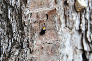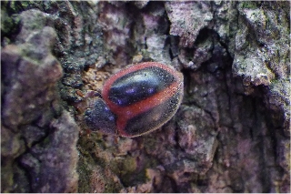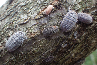 【右】正体不明の虫。実はオオワラジカイガラムシのメス。幹にベニヘリテントウがいたのでそれがヒントになって判った