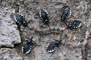【右】オビカレハの幼虫の体液を吸うヨコヅナサシガメたち。オビカレハはほとんどペシャンコになっていた