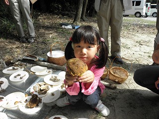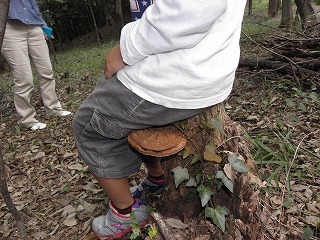 【左】サルノコシカケが生えた切り株に座る。 【中】少し新鮮なノウタケを持って上機嫌。ノウタケの若いのは食 【右】ミイノヒガサタケ?
