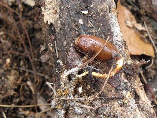 【左】ドングリの根が秋に出て冬越しです。春になると葉が伸び出します。  【右】ぷくぷく太っておいしそうなカミキリムシの幼虫