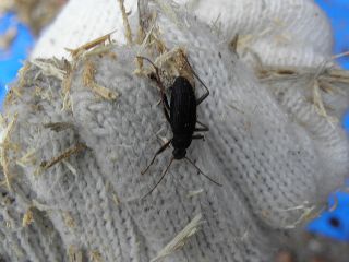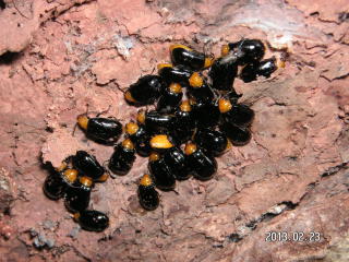 【左】 クロウリハムシ(ヤシャブシ?の皮を剥いだら集団越冬していました。ハムシさんごめんなさい)