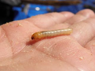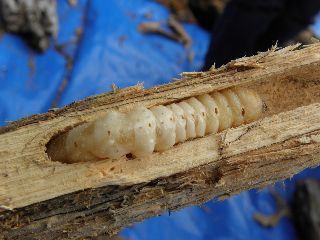 【左】お父さんと一緒に朽ち木の中のムシ探し!  【右】ユミアシゴミムシダマシ幼虫