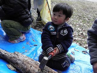 高根の森公園に集合。2歳のかわいい子とお父さん、おばあちゃんと2人の小学生のお孫さんの5人の参加者。あまり遠くまでは歩かずに少し林の中をまわって始めの所にもどった。指導員が用意した椎茸のほだ木の朽ちかけたものを分解して木の中をのぞいた。はじまってすぐびっくりして飛び出したのは成虫のユミアシゴミムシダマシ。進んでいくうちに、大きなカミキリムシの幼虫がざくざくでてきた。まるまるしておいしそう!キマワリの幼虫やユミアシゴミムシダマシの幼虫もみられた。コクワガタの成虫がペアで越冬していた。例年より寒いと言われるが、側溝ではゴミムシもみられ、少しづつ生き物の活動もはじまっていることが感じられた。近くの畑のアブラナにはセイヨウミツバチがミツ集めに飛び回っているのがみられたり、ナナホシテントウがみられたりした。 (記・竹内秀 )