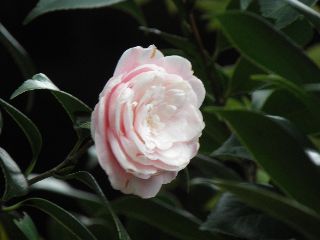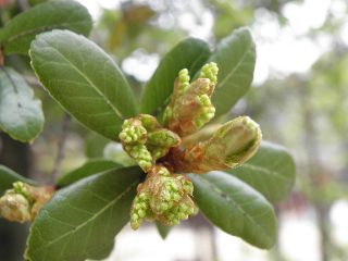 【左】ウバメガシの新芽と雄花芽生え   【中】カヤの木 大きいです   【右】桜にもみえる?神後院つばき