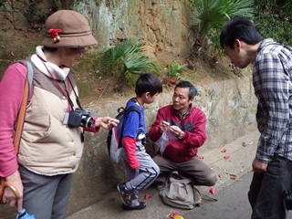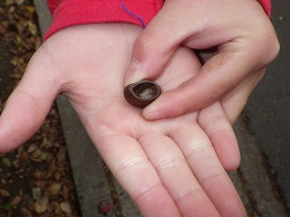 【左】ツバキの種(たね)で笛づくり   【右】ミツバチの巣を観る
