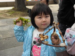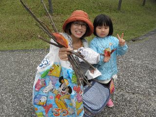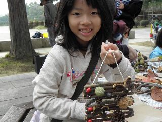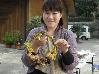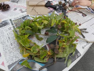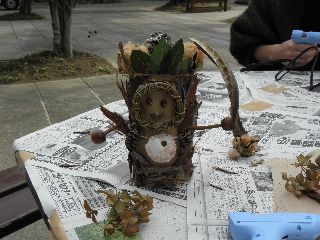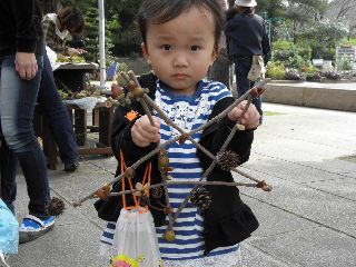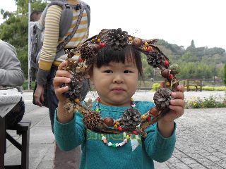 三連休の後半は雨の予報で、今日2日は雨は大丈夫という曇空。風もなく外で工作の用意をした。ところが、5分前になっても参加者は5人ほど。公園には紅葉めあてに散歩するシルバーや親子連れがちらほら。どうなることかと気をもんだが、会を始め実を拾うため30分ほど公園を軽く回って帰ってくる頃には24人の参加者となり、園内放送も入れずにすんだ。男の方で植物のことが知りたいと参加された方や、先週健康の森での参加者で名古屋からの参加もあった。アラカシのまだ青さも残る実が拾え、コナラ、クヌギとドングリロードを通る。子どもならず大人までもが歓声を上げて拾う。クヌギは未成熟果が多いように思われた。小さい子が多かったので、ハクウンボクの方へは行かなかった。3年連続で、参加された親子連れもいたり、工作の様子を見て工作だけ参加という親子や、終わりごろに参加したいのだがと来られ作っている親子もいた。  今年の工作も見本無しでスタート。はじめからオリジナルで、どの作品も世界に一つだけのステキなものができあがった。子どもの年齢が小さかったが、大人顔負けの作品を作る子もいた。大人は、クリスマスを意識して楽しんでステキな作品を作っていた。 (記・竹内秀 )