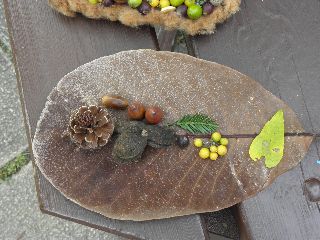 【左】でーきた  【中】去年も参加してくれました。1年ぶりで成長した姿ではいポーズ   【右】おいしそう。彩りがすてきな木の実のケーキみたい。
