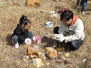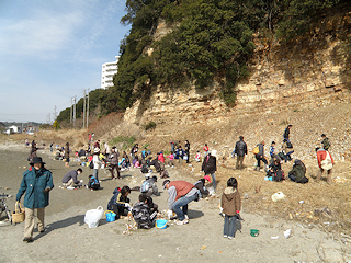 駐車場への入り口道路付近で受付していましたが、参加者が多くなり、路上に溢れ、自動車の通行の妨げになるほどでした。参加者はほとんど親子でしたがそれぞれバケツ、ハンマー、タガネ、軍手等…準備万端でヤル気満々です。集合場所から“化石探し”の場所まで約1km徒歩での移動もへっちゃらです。ただし、今回は小さなお子さんも多く、パパやママがだっこやおんぶする光景も見られました。現地ではエネルギッシュに化石探しに挑戦し、それらしいものがゲットできると、同定屋さんのところへ持って行くなど目を輝かしながら動き回っていました。多くの人がまずまずの収穫で満足げに解散しました。当然、帰路も約1kmをテクテク歩いて駐車場に到着です。(榊原正・記)
