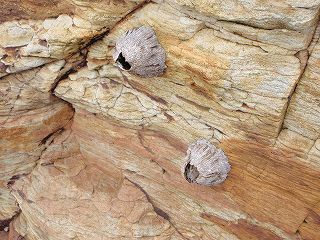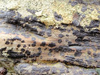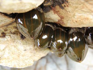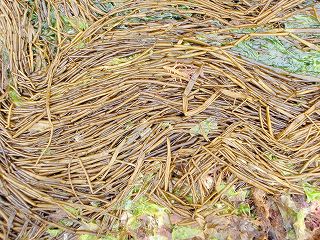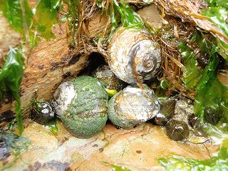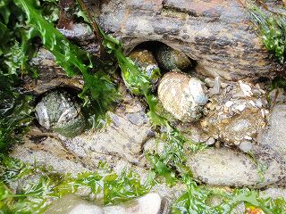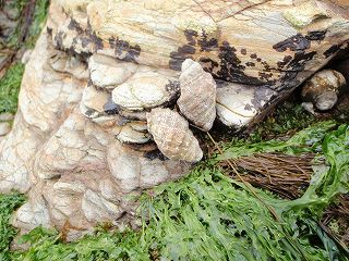 【左】イソハンモン(黒い斑紋)…藻類  【右】カヤモノリ
