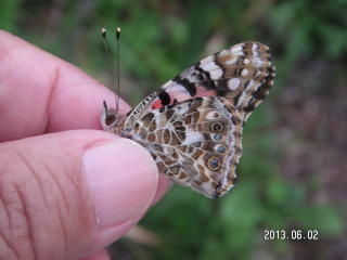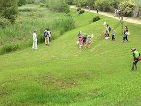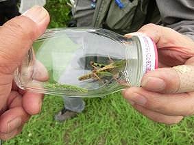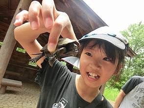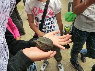 薄曇りの快適な天気の中、虫の集まる花や、いろいろな木を見たり、オオシマザクラのさくらんぼやグミの実を試食したり、チョウやバッタ、キリギリス、オオカマキリ、コシアキトンボなどのトンボ類を追いかけて捕まえたりしました。クサガメも見つけました。樹液にはオオスズメバチやアカタテハがきていました(記・吉川洋 )