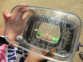 【左】クサカメさんをみんなで観察しています 【中】オオスズメバチが樹液を吸っています 【右】捉えたベニシジミ見せてくれました