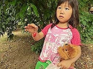 【左】サクランボの実が熟していました 隣の友達が試食しています 美味しいかなー?