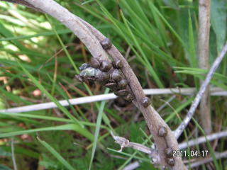 アケビの雄花・雌花を観察。ホトケノザ、ヒメオドリコソウ、タンポポ2種、スズメノヤリ、テッポウ、カタビラ、エンドウなど定番植物がにぎやか。ヤシャブシの実と若葉のコンストラストがいい。スズメノテッポウの笛は今年も健在。往年の少女が上手に鳴らす。子どもたちも挑戦し、見事音を出す。古川先生がギシギシの天ぷらを用意してきてくださって試食。皆さん味をしめた模様。セイタカアワダチソウもおいしいらしい。来年は春の野草の試食会をしてはどうか と話がはずむ。