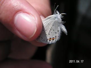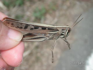 今日は晴れ。ただ風が有りちょっと肌寒さを感じる。桜が終わってようやく緑の芽が吹き出した。5歳から70歳までの一行19人。タモを持った子供が4人居て、お互い草原を探るように振る姿が愛らしい。生まれたてのバッタ類がぴょこぴょこと跳んだ。モンシロ、ツマキチョウも姿を見せる。