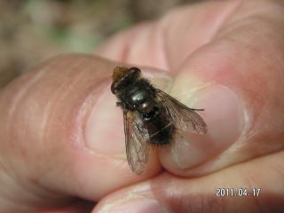 【右】セスジハリバエ(林道脇の地面すれすれを何匹も飛び回っていました)