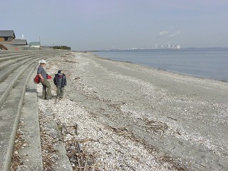 【左】飛び入りで観察して、大喜び 【中】布土川河口で観察 【右】海岸に貝殻がたくさん打ち上げられていました。