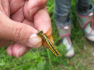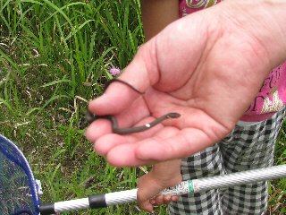 【左】溝の中で何か動いた!          【中】ヒバカリの赤ちゃんがいました          【右】トンボも捕まえました