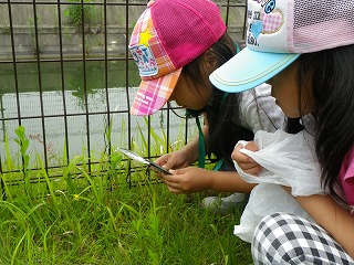 【左】溝の近くで生き物探し    【右】ルーペで観察中