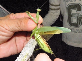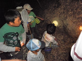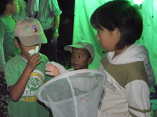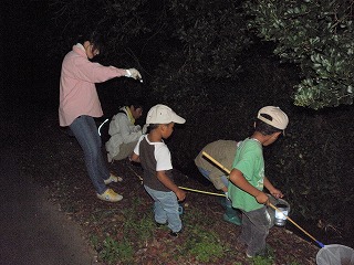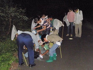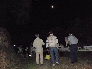 スズムシ、マツムシ、コオロギ等の声を聞きながら虫やカエル、クモ、ザリガニ、ヘビといろいろな生き物を観察でき、20:30頃灯火場所に戻りました。森田さんが捕らえた生き物の説明に会で購入した観察カップを早速使っていたのには感心しました。