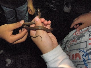 【左】カマキリ別名チョウセンカマキリ 【中】やさしい蛇、ヒバカリに触りました。 【右】アリ類の集団(何かの幼虫らしきものがいます。アリが集まった原因かもしれません)
